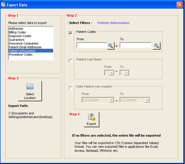 The MedOffice Export Data screen is divided into four simple steps: 1) Select the data to export, 2) Select any filters shown (the filters change depending on what type of data has been selected); 3) Select the directory to which you want to export and 4) click Export. MedOffice makes it that simple!
